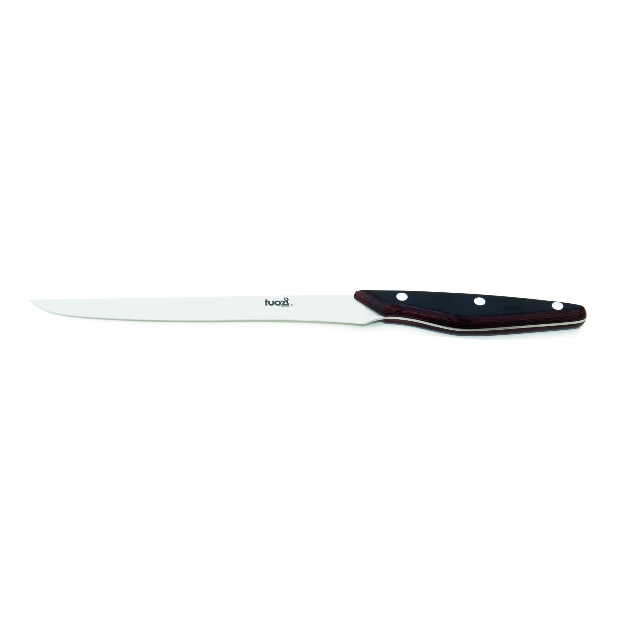 Barbecue tool. 304 1 ½ hard stainless steel (glazed) and red and black plywood handle.
