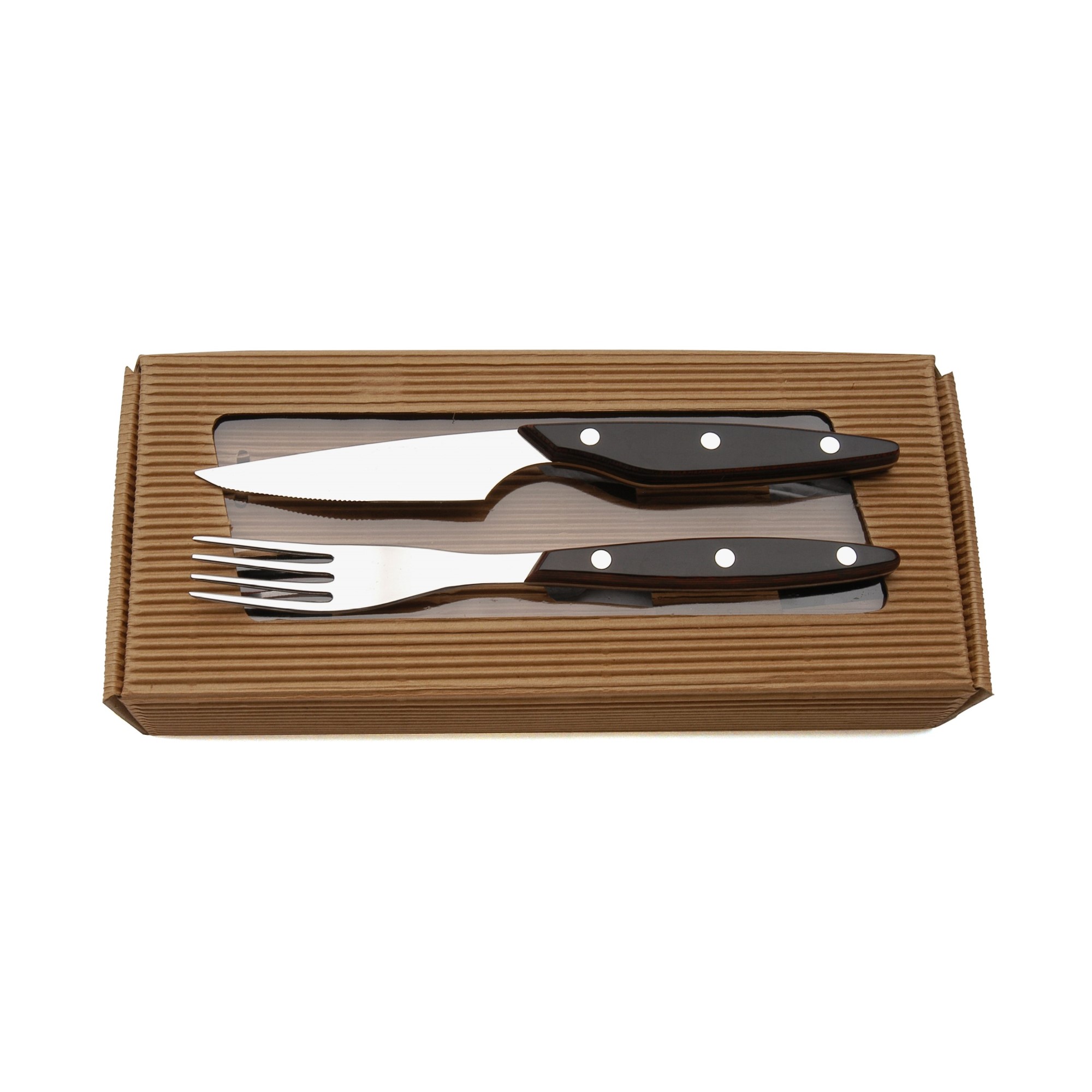 6 knives + 6 forks set. 304 1 ½ hard stainless steel (glazed) and red and black plywood handle.