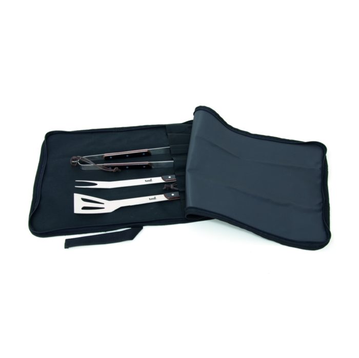 3 piece set + bag. 304 1 ½ hard stainless steel (glazed) and red and black plywood handle.