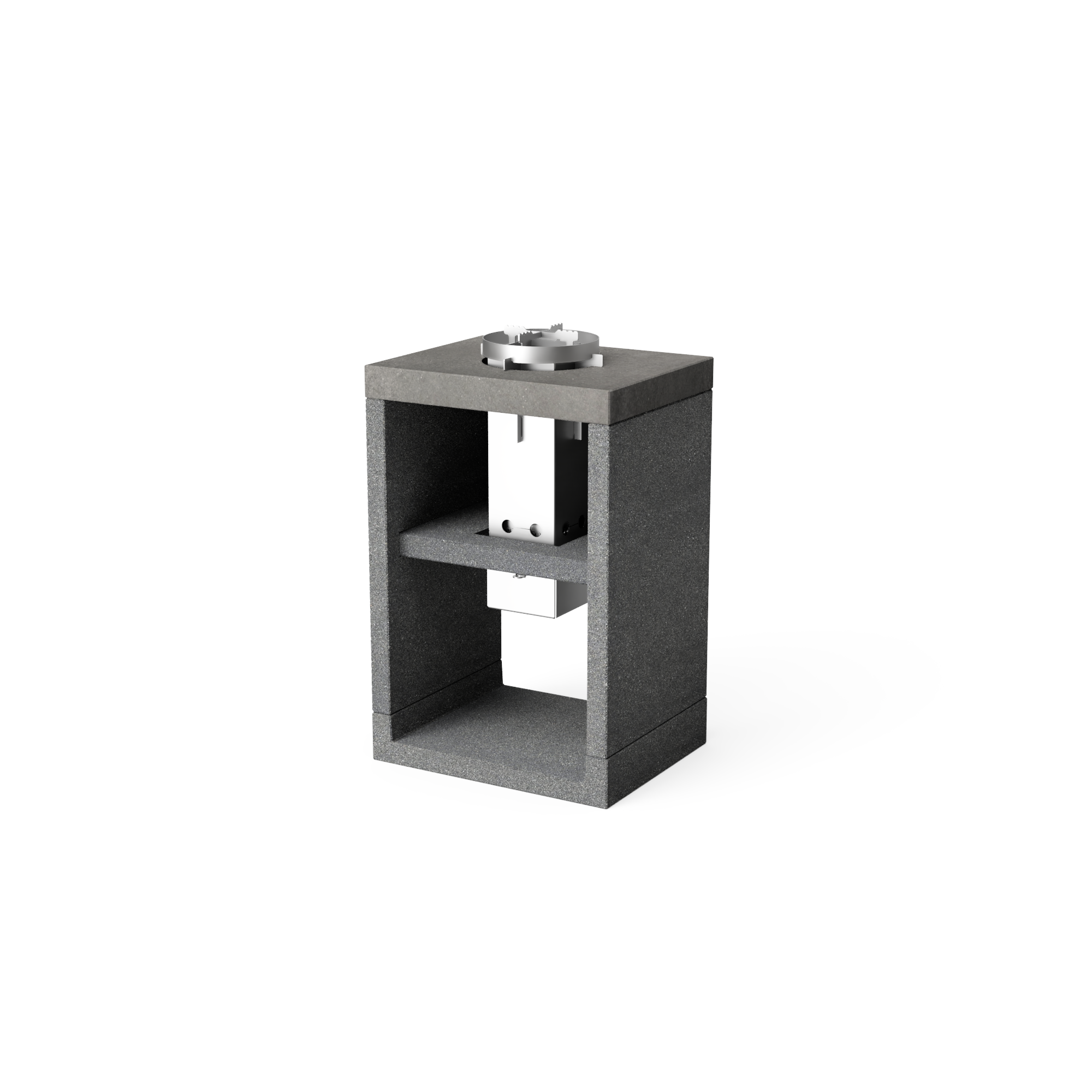 Grey textured concrete. Ideal to organize outdoor kitchens. Textured concret. Double chamber combustion wood use stove. Extremely fast to reach cooking temperatures. Cook with a pan, wok, plancha and other cookin stove accessories. Very low wood consumption. Low emissions. Can be used with any kind of wood, such as dry garden waste wood or other dry biomass fuel! Hight temperature powder coating finishing.