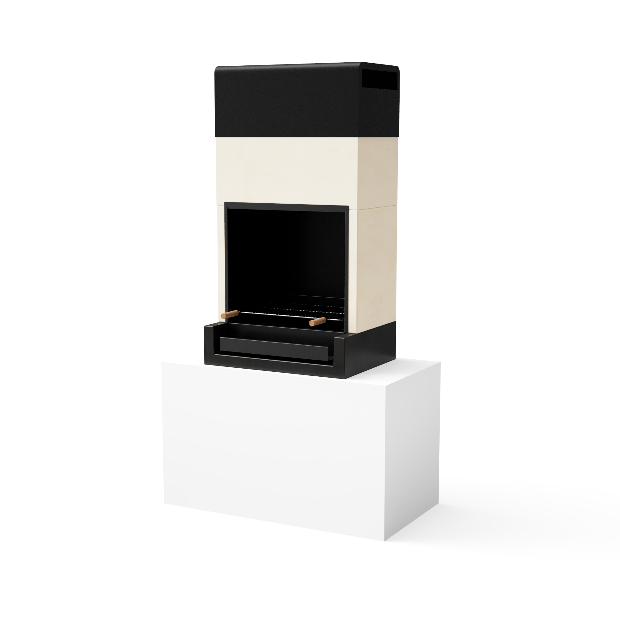 White and grey concrete. Textured side pieces. Bottom shelf in plain white concrete. Use of charcoal. Nickled grill 51x41 cm.