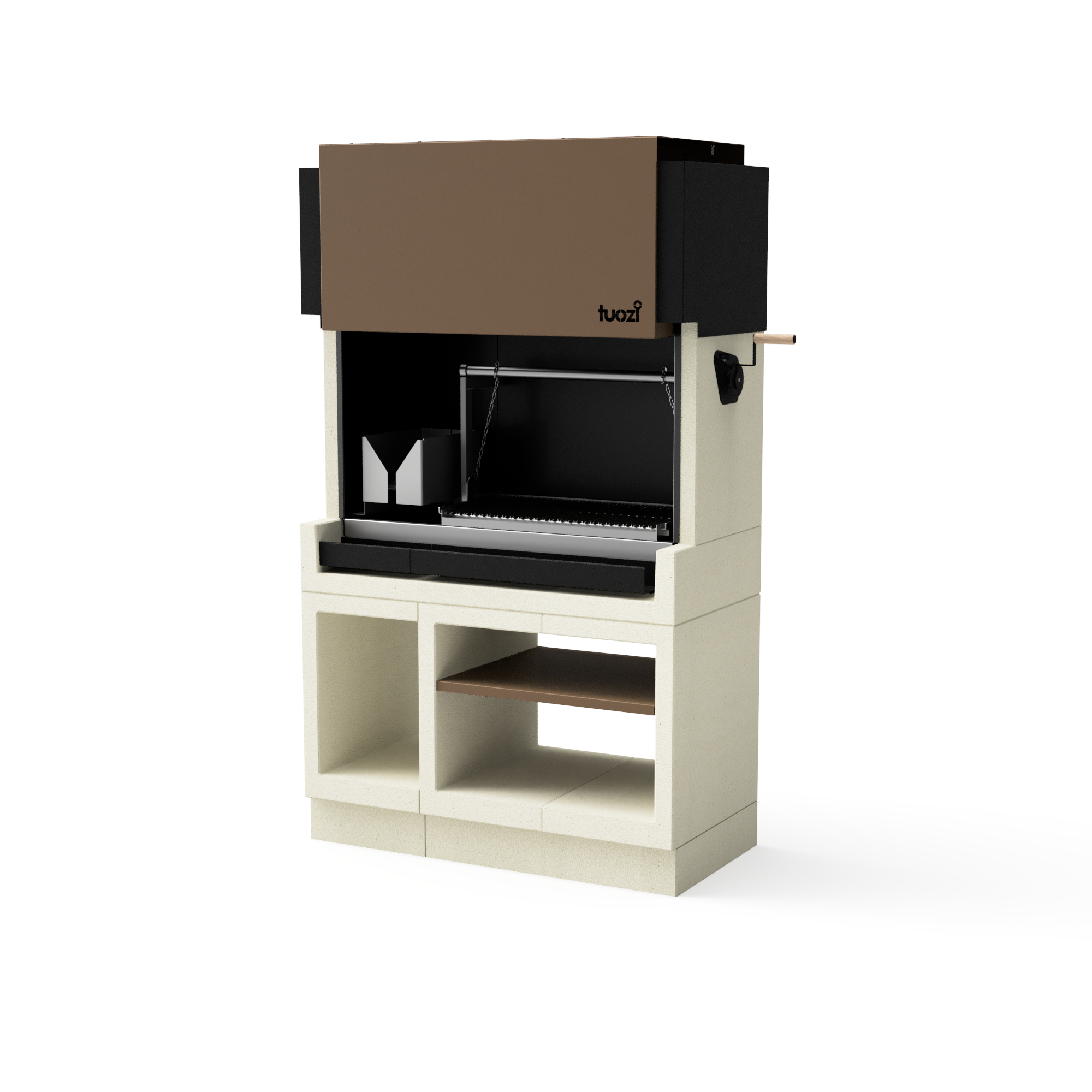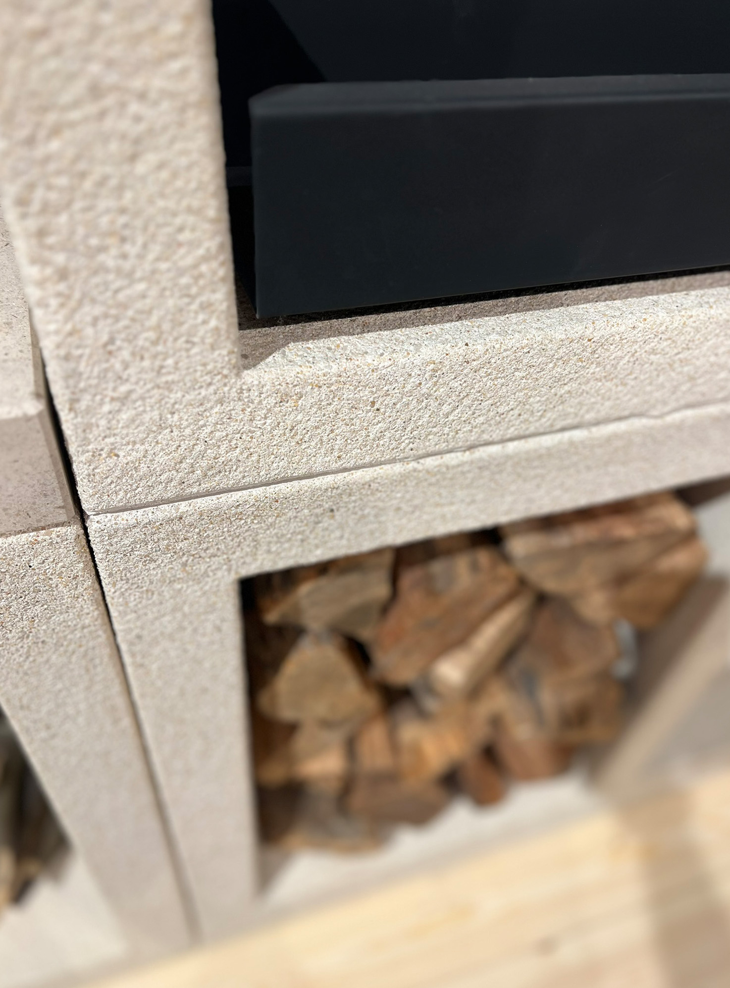 White and grey concrete. Textured side pieces. Bottom shelf in plain white concrete. Use of charcoal. Nickled grill. Painted