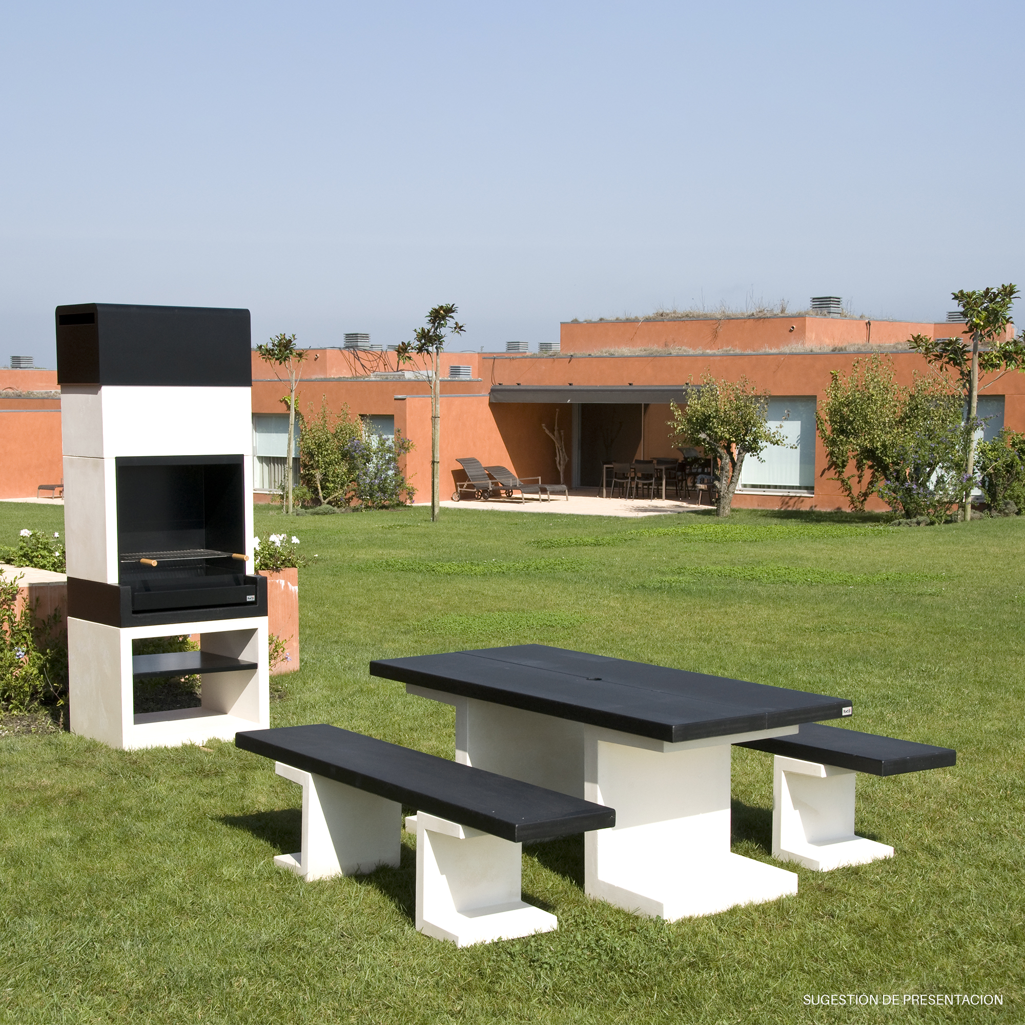 Tribeca bench, made of smooth concrete, resistant to atmospheric conditions. Finished with a mate varnish. Metal structure fi
