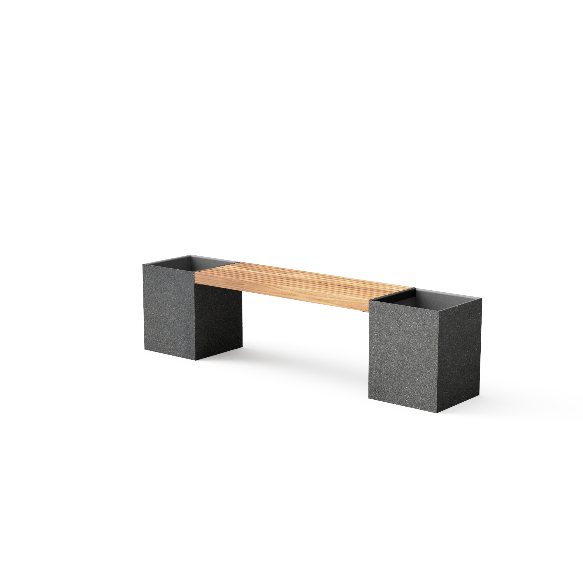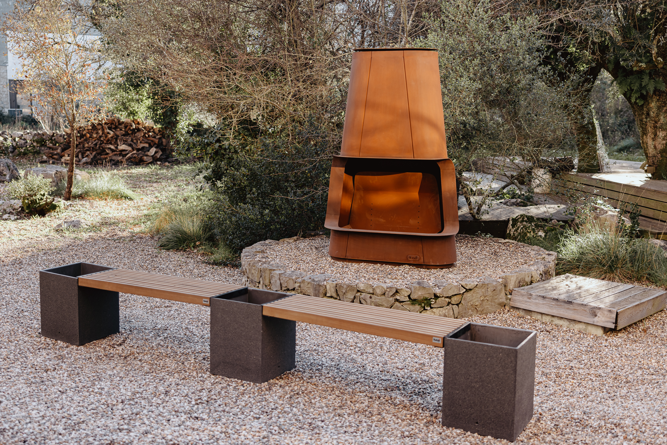 Table surface,made of smooth concrete, resistant to atmospheric conditions. Finished with a mate varnish. Metal structure fin